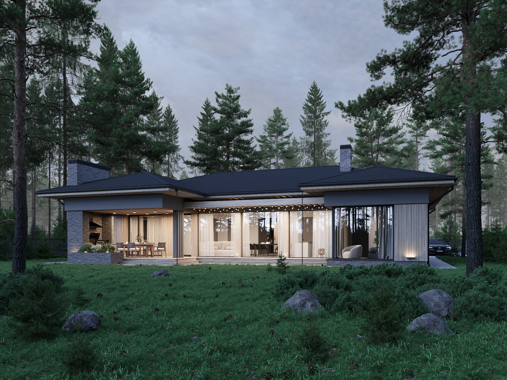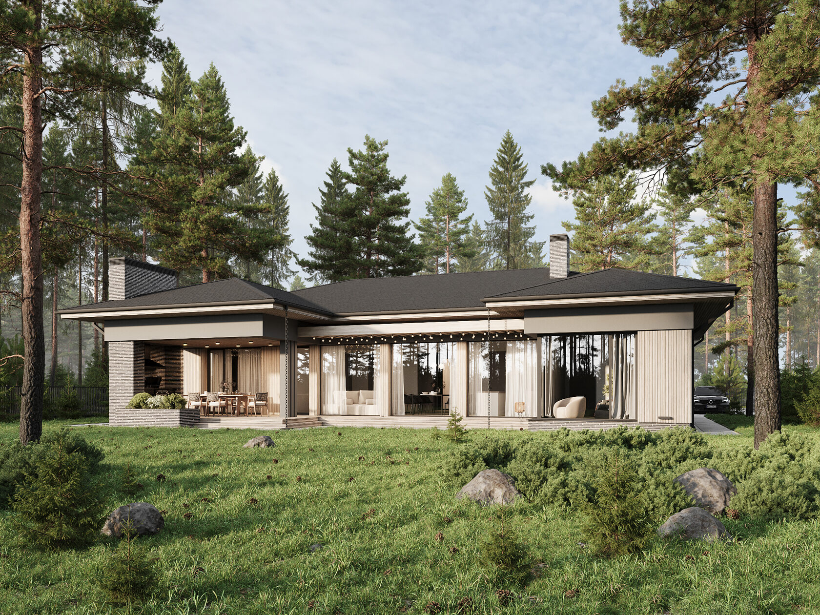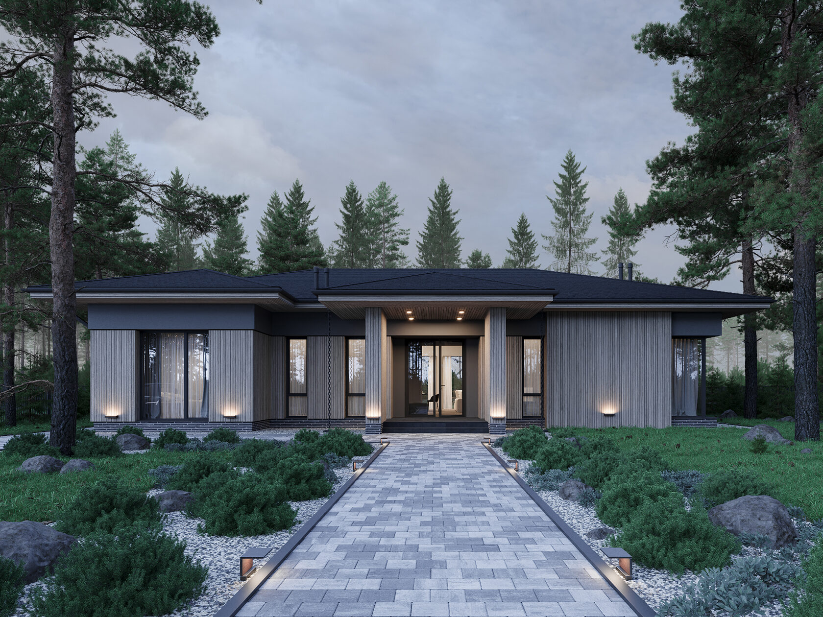 В этом стиле преобладают горизонтальные линии и дом как бы стелется по земле, органично вписываясь в любой ландшафт.