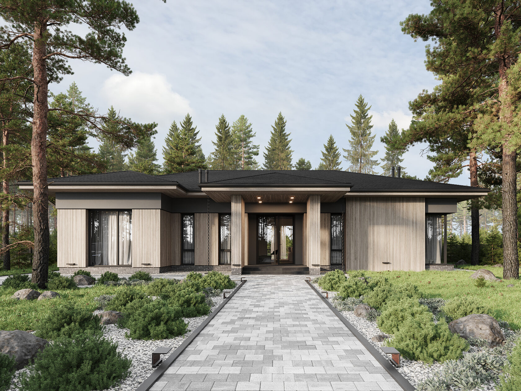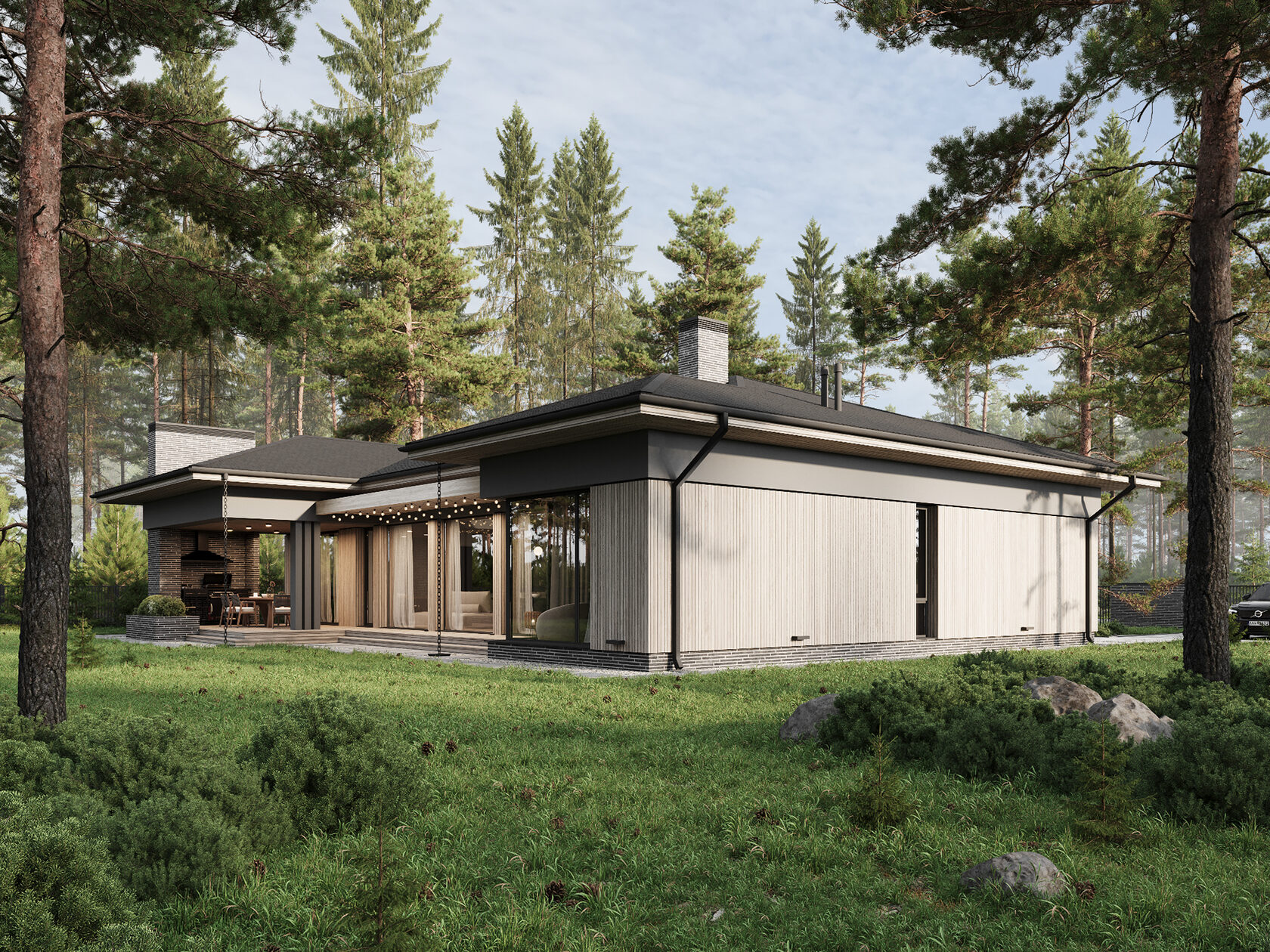 Первый — глубокий чёрный: графичный, собранный, с акцентом на форму и тень, где штукатурка, клинкер и термоясень работают как единое целое.