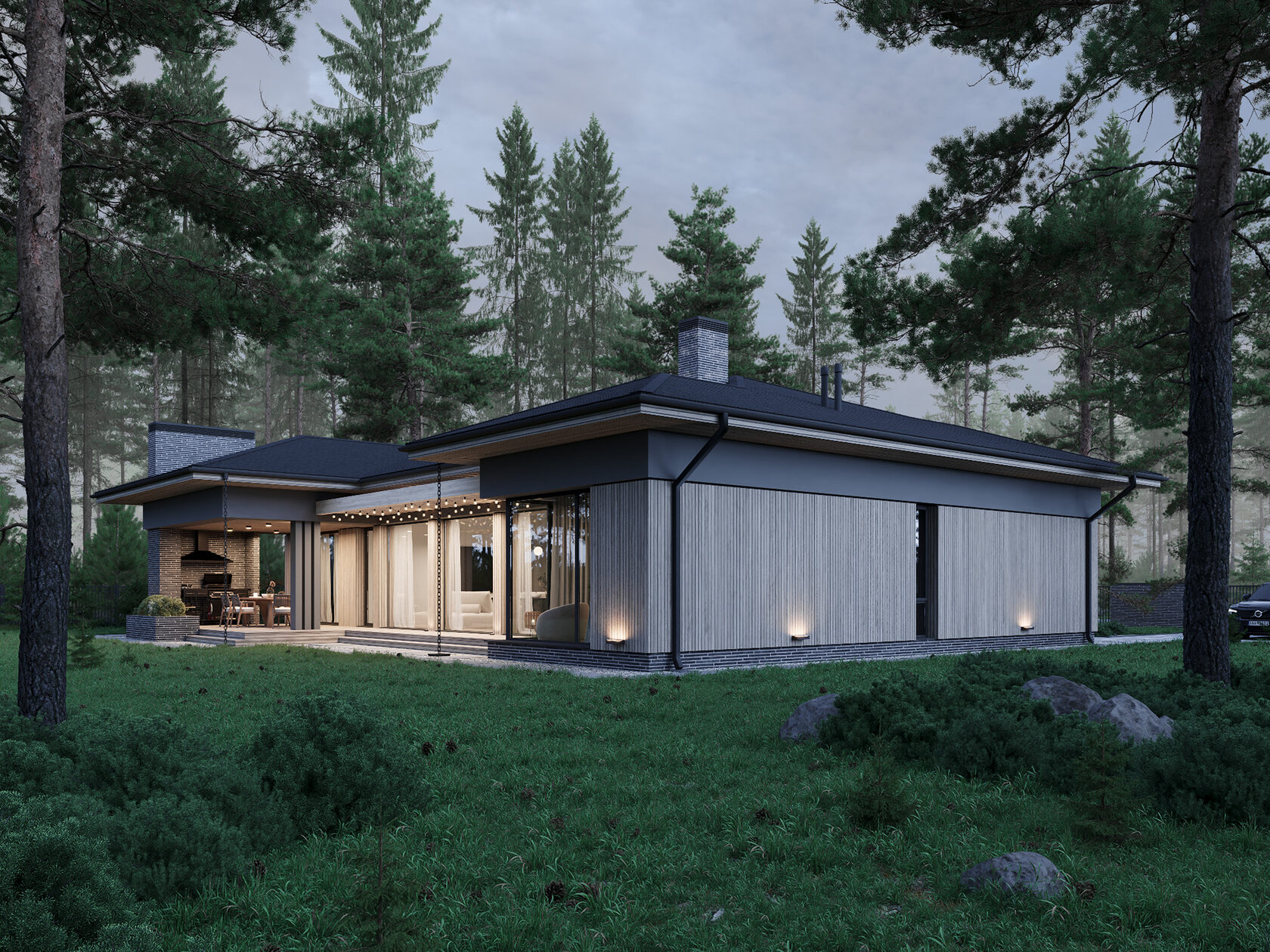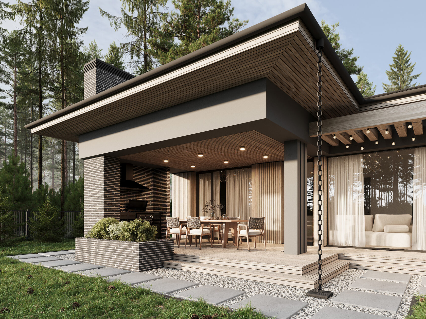 В этом проекте у вас сразу будет уютная закрытая терраса с печью-барбекю!!! И вдобавок к ней открытая терраса 29,6м².