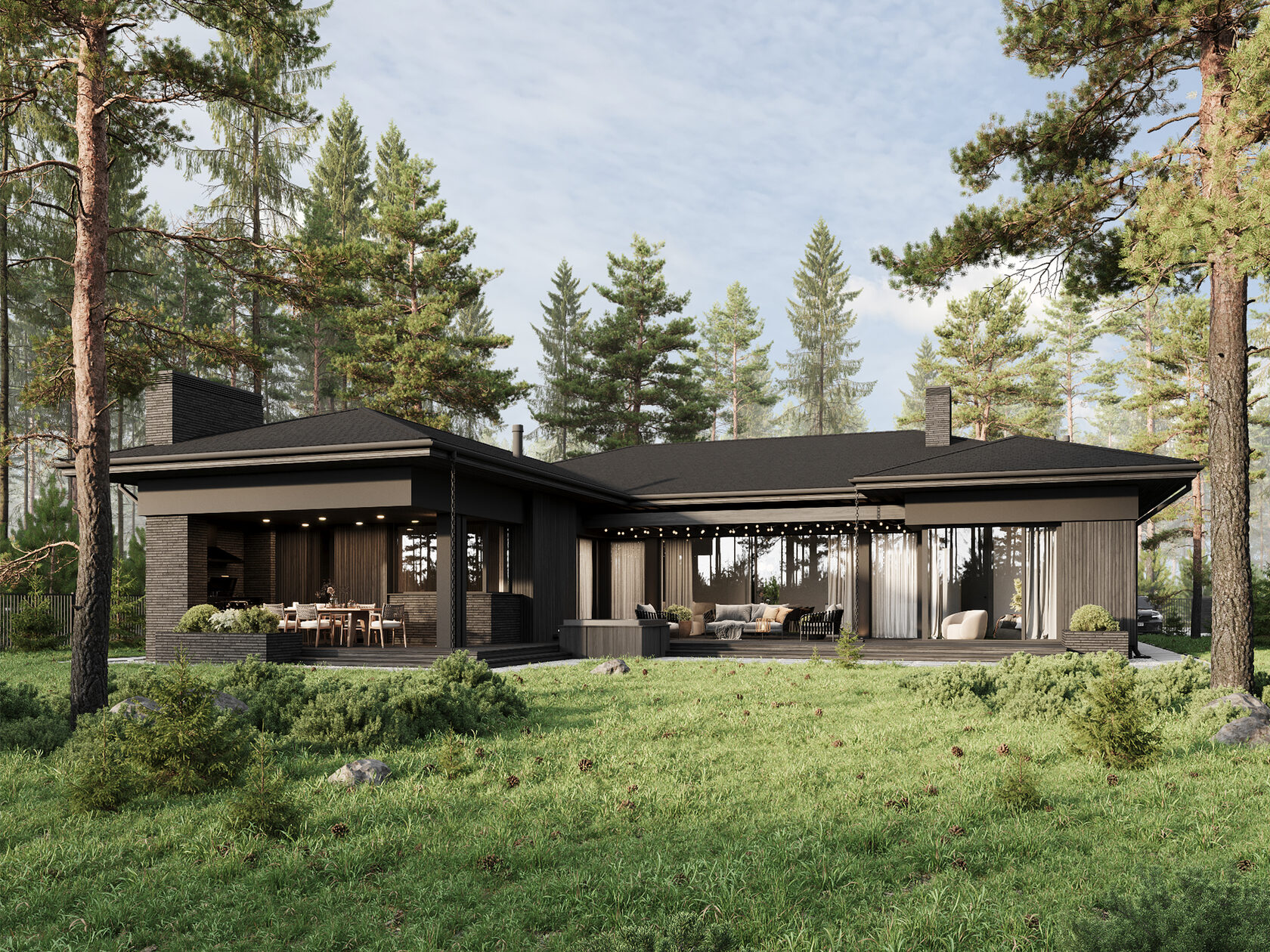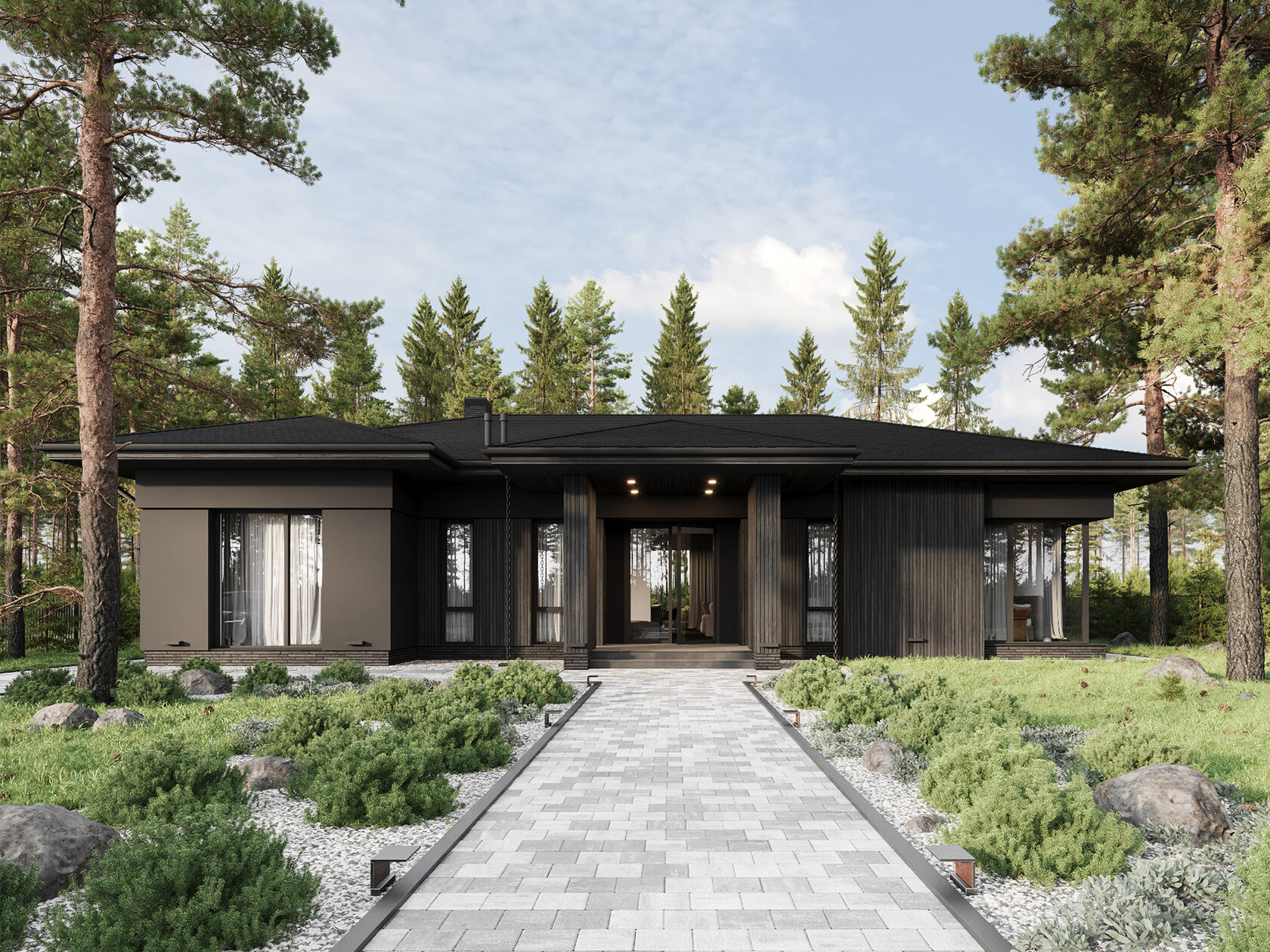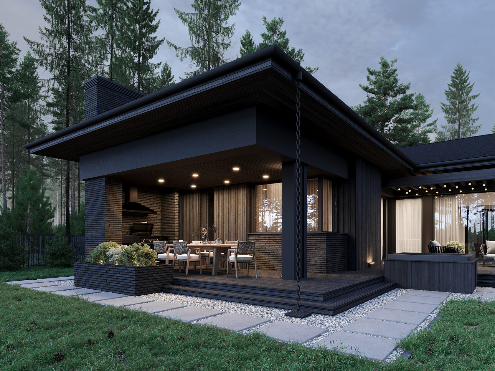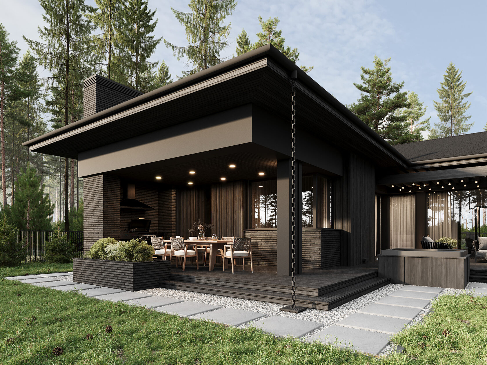 Первый — глубокий чёрный: графичный, собранный, с акцентом на форму и тень, где штукатурка, клинкер и термоясень работают как единое целое.