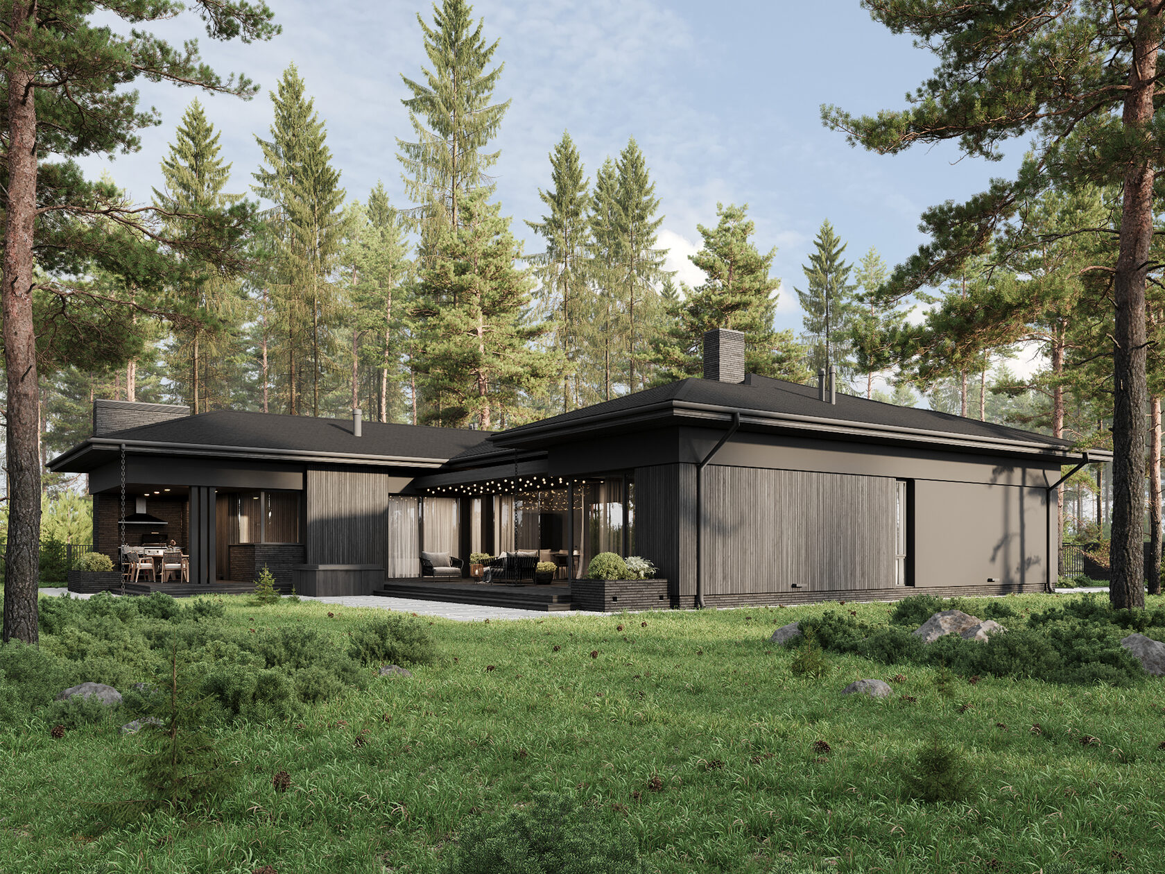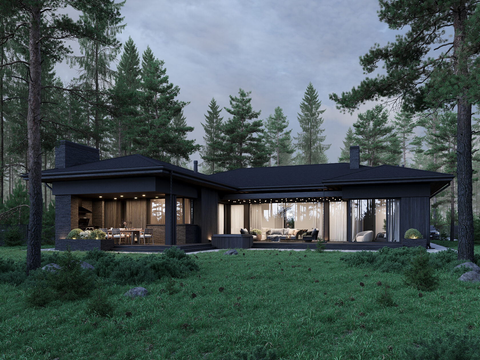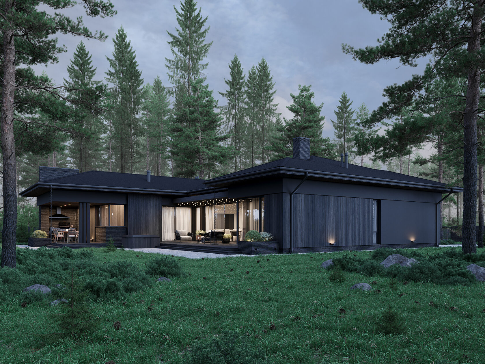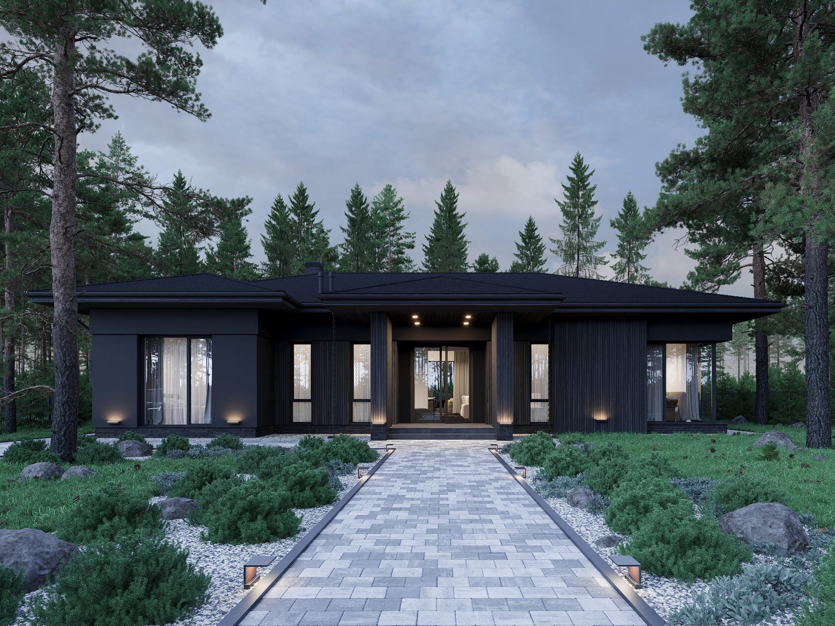 Первый — глубокий чёрный: графичный, собранный, с акцентом на форму и тень, где штукатурка, клинкер и термоясень работают как единое целое.